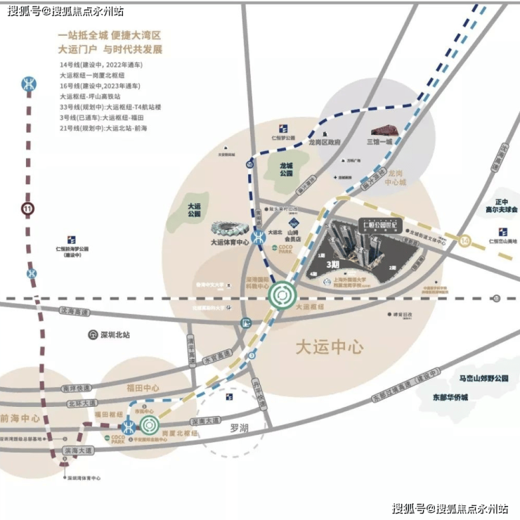 交通:【大运枢纽站】规划4轨于此交汇。3-14-16号线(已开通)33号线(建设中中6站直达机场),乘坐14号线可8站至福田,实现龙岗与福田快速通达。