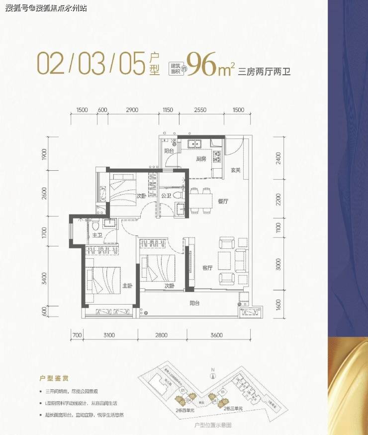约96㎡的3房2卫:该户型使用率高达约90%,同样是三开间朝南,配备约6.4米宽连廊式观景大阳台,从容品阅生活,悦享舒适温馨。
