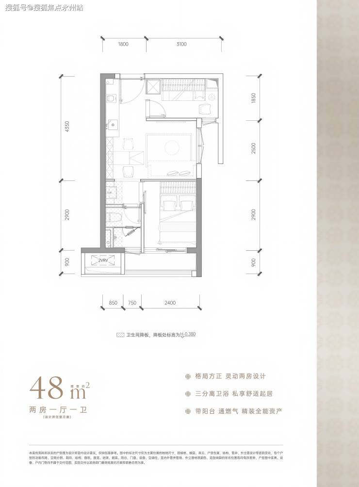 38㎡单房(小户型稀缺):麻雀虽小五脏俱全,带独立阳台、通燃气,卫浴干湿分离,得房率约69%