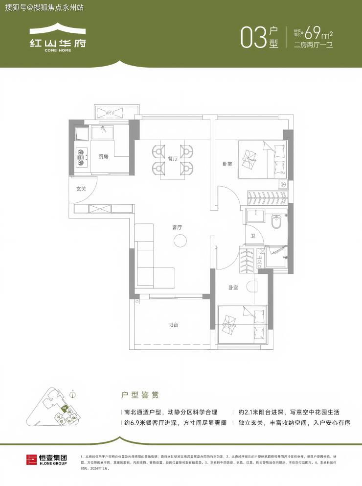 格局:南北通透竖厅,客餐厅进深6.9米,阳台进深2.1米,形成“跑道式”空间。