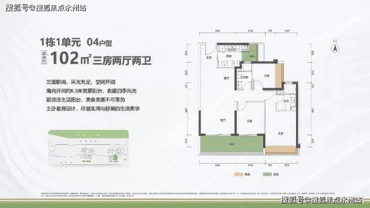 102㎡的3房2厅2卫,1栋1单元02户型,设计的是经典竖厅格局,进门入户玄关,客厅3.5米开间,LDKB一体化设计,三开间朝南,动静分区,客厅连接次卧出6.3米长的巨幕大阳台,二字型厨房还带1个生活阳台,卫生间干湿分离,西南朝向。