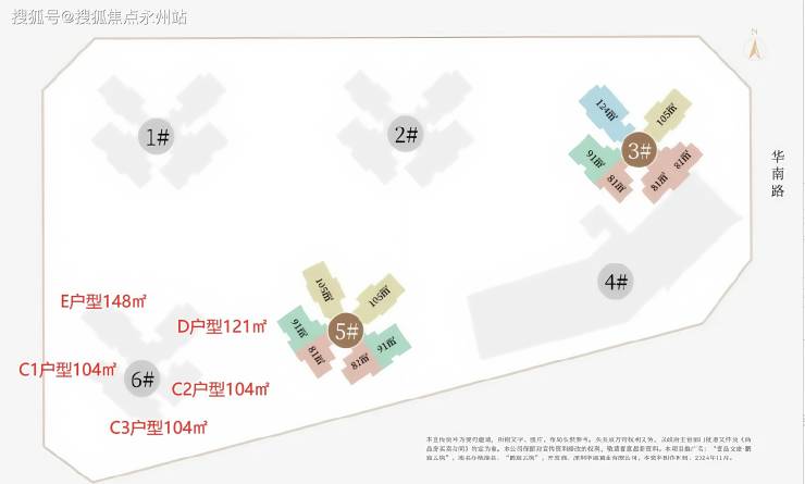 本次将推的是6栋住宅,总高32层,2梯5户设计,总共155套,面积有104-121-148㎡的4房2卫户型。