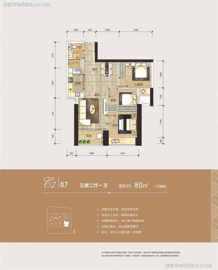 80㎡两居室(主力户型):经典两室两厅一卫设计,户型方正,南北通透,动静分区明确。客厅开间 3.8 米,与餐厅相连形成一体化公共空间,南向面海阳台引入180°大鹏湾景观,主卧配备270° 转角飘窗,次卧可灵活改造为书房或儿童房,空间利用率达85%。