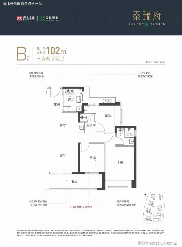 102㎡三房两厅两卫:竖厅格局,客厅 3.5 米开间,6.3 米阳台,三段式卫生间,得房率 77.48%(不含赠送)