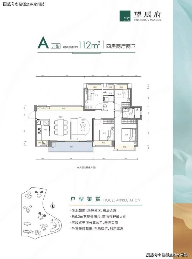 112㎡的4房2厅2卫,设计的是横厅南北通透格局,客餐厅6.2米开间,三开间朝南,4个卧室分别是3.3米/2.9米/2.5/2.4米的宽度,全屋飘窗,U型厨房,公卫三段式分离设计,得房率:80.14%(不含赠送),6.2米长的超大阳台,朝正南或西南朝向,看花园景观