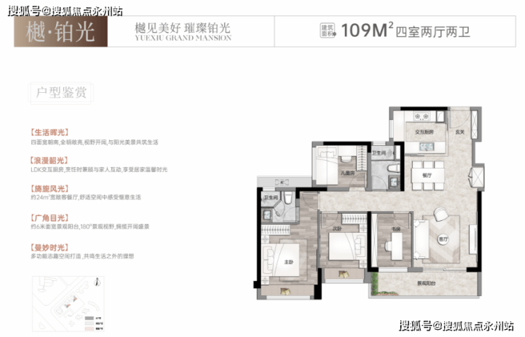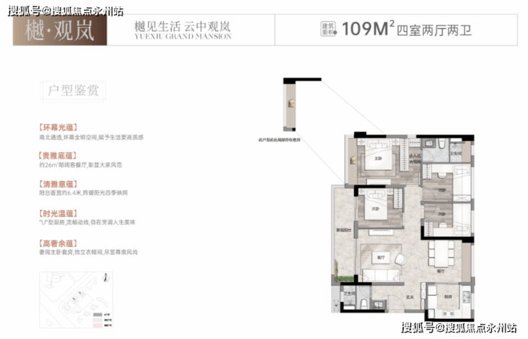 建面约109㎡A户型4房2厅2卫:南北通透,约26㎡餐客厅,传统竖厅,约6.4米景观大阳台,主卧套房带衣帽间设计;185套,实际使用率81%,加赠送90%。