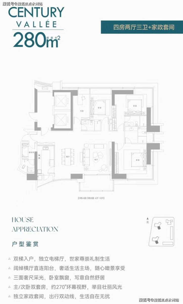 280㎡的4房2厅3卫+家政套间,仅3栋A/B座B户型,双梯入户,设计的是横厅格局,客餐厅8.5米开间,主卧大套间约25㎡,大次卧套间约19㎡(不含卫生间),小次卧约11㎡/8.7㎡,另外还有保姆套房,L型厨房,得房率约66.03%(不含赠送),约9.66㎡观景大阳台,西南朝向,看高尔夫景观。