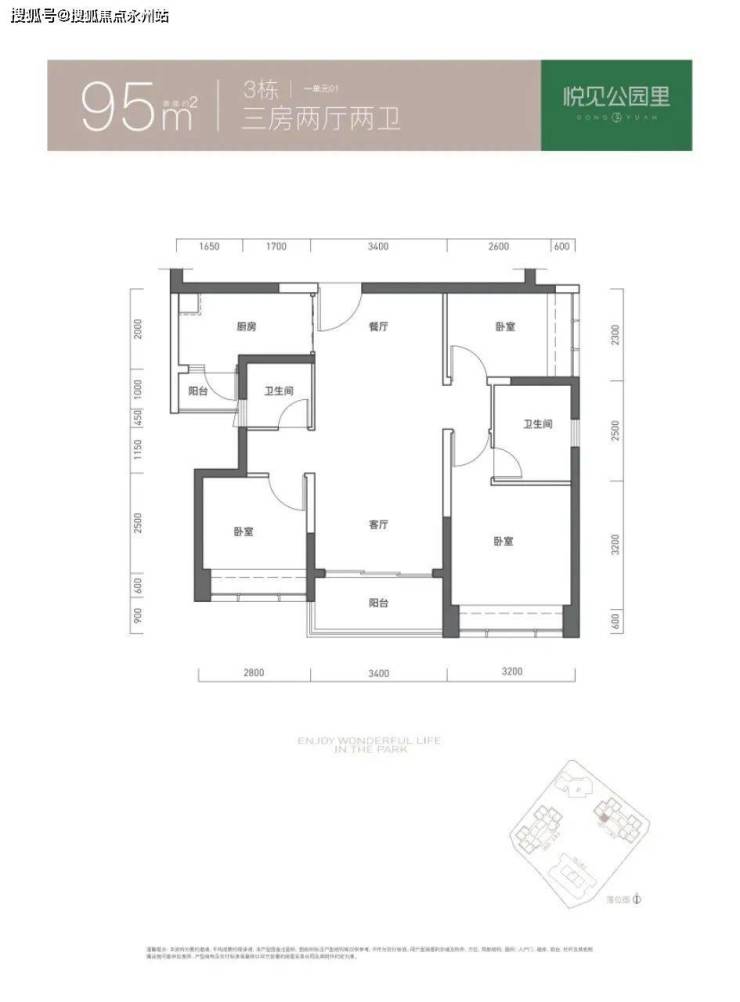 95㎡的3房2厅2卫,仅3栋1单元01户型,设计的是竖厅双龙抱珠格局,客厅3.4米开间,三开间朝南,3个卧室分别做到了3.2米/2.8米/2.3米的宽度,L型厨房带1个生活阳台,公卫三段式分离,得房率73.71%(不含赠送),西南朝向。
