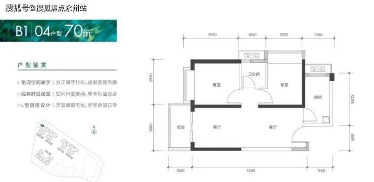 70㎡的2房2厅1卫,仅1栋B1座04户型,设计的是竖厅格局,客厅3米开间,餐客厅一体化设计,2个卧室分别做到了2.95米/2.35米的宽度,L型厨房,卫生间干湿分离,得房率:75.66%(不含赠送),阳台朝西北向。