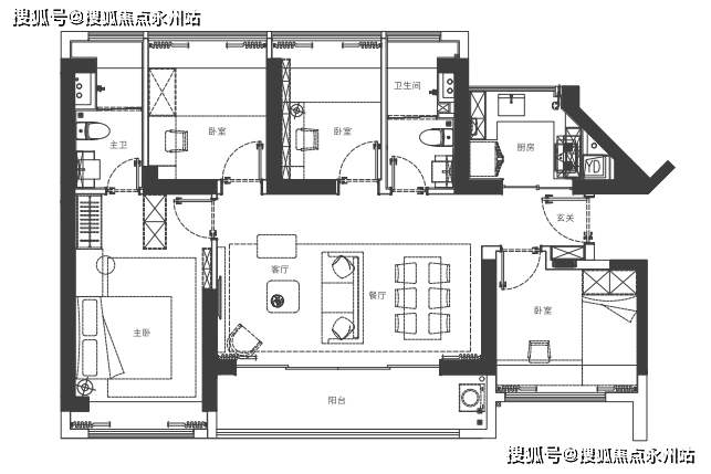 96㎡ 3房2厅2卫 :典型的竖厅鼻头户,共8条腿,每个楼栋均有分布;