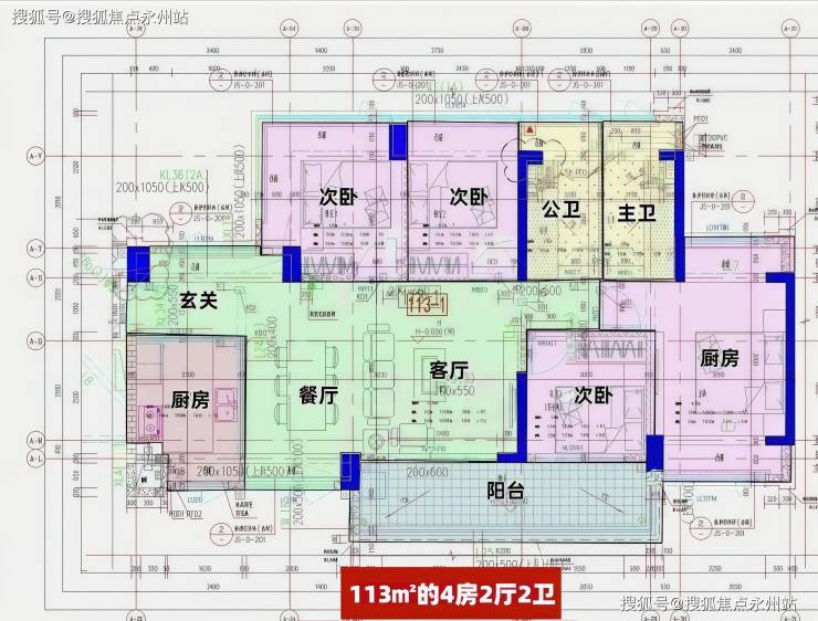 113㎡的4房2厅2卫,设计的是横厅南北通透格局,独门独户,进门入户玄关,客餐厅6.2米开间,LDKB一体化,全屋10面飘窗,主卧南北通,4个房间分别做到了主卧15.41㎡/次卧9.91㎡/次卧9.9㎡/次卧8.33㎡(去掉墙体,包含飘窗),客厅连接次卧出6.8米长的大阳台,U型厨房,卫生间干湿分离,得房率约95.73%(包含赠送),阳台主朝东南向。