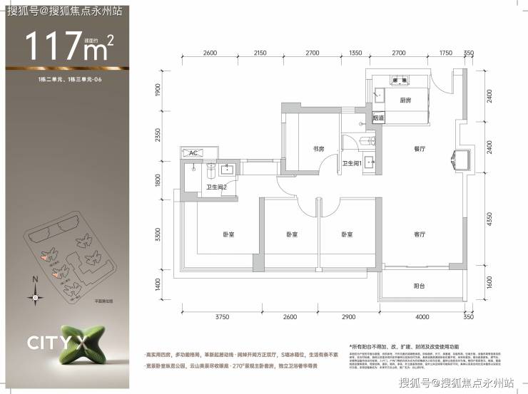 推售面积有88-98㎡的3房2卫,108-117㎡的4房2卫户型
