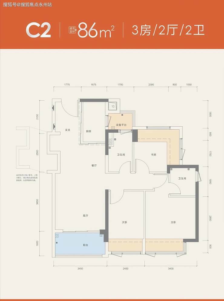 86㎡三房两卫:折后总价227-244万,单价2.6-2.8 万/㎡,得房率约98%。