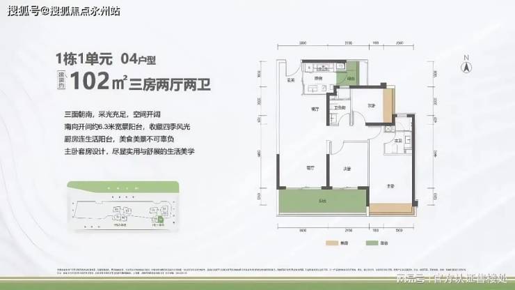 102㎡的3房2厅2卫,1栋1单元02户型,设计的是经典竖厅格局,进门入户玄关,客厅3.5米开间,LDKB一体化设计,三开间朝南,动静分区,客厅连接次卧出6.3米长的巨幕大阳台,二字型厨房还带1个生活阳台,卫生间干湿分离,西南朝向。