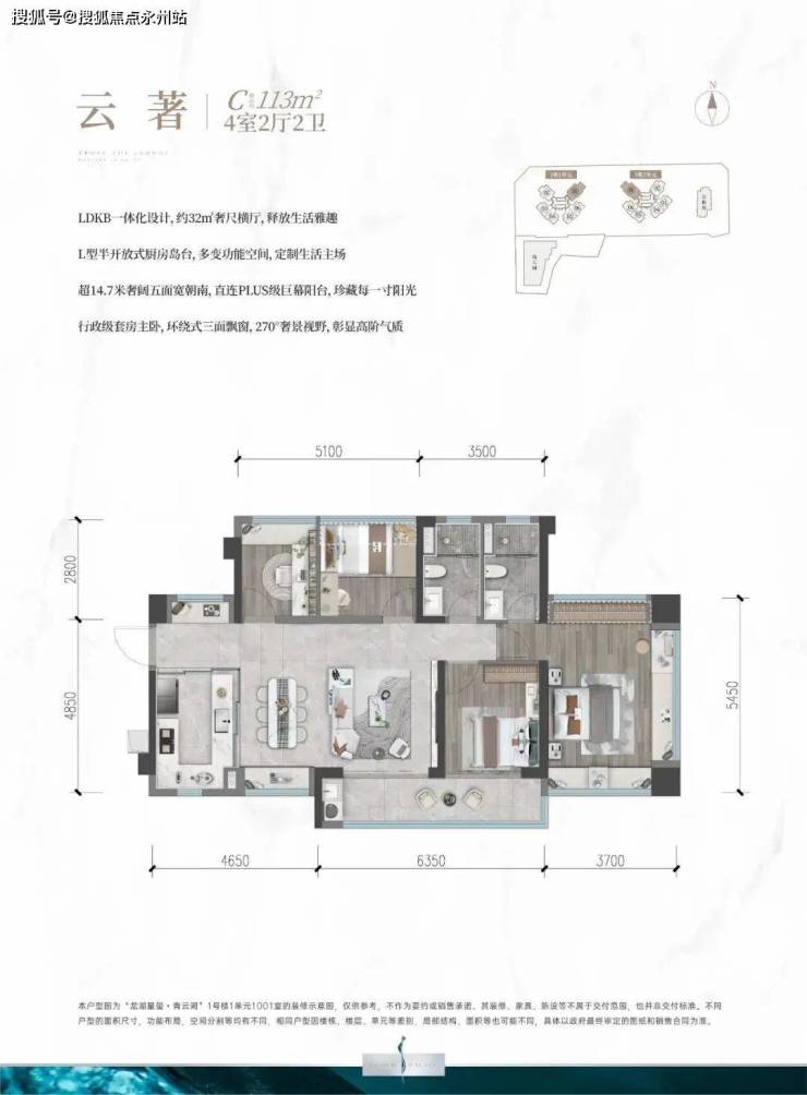 113㎡的4房2厅2卫,设计的是横厅南北通透格局,客餐厅5.4米开间,五开间朝南,朝14.7米面宽,主卧3.7米宽三面飘窗,客厅连接次卧6.35米的大阳台,U型厨房,得房率:75.33%(不含赠送),阳台主朝西南或东南向。