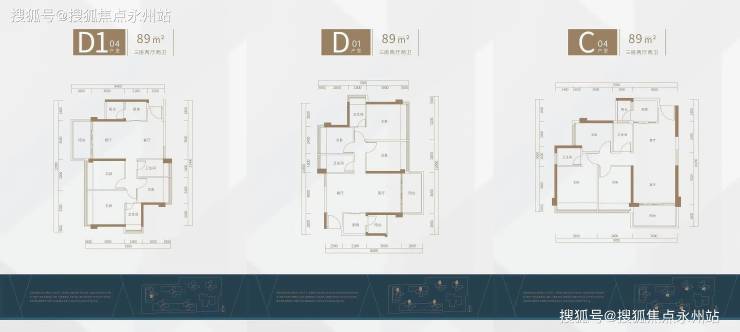 C-04、D-01、D1-04均为89㎡3房2厅2卫:D01、D1-04户型朝东向,餐客厅独立,功能分区明显,餐厅有窗户与阳台形成对流,卧室及卫生间均带有采光飘窗,采光通透性好。且客厅开间达到3.6米,空间感阔绰;C04为竖厅布局,也是及比较经典实用的户型。