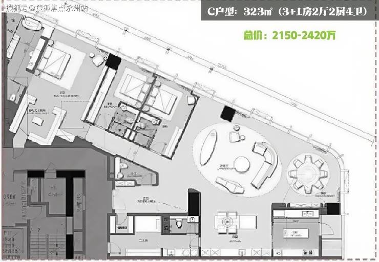 A户型:396㎡(3+1房2厅2厨5卫)LSD操刀、270°城市景观、全套房、双主卧设计、9.9米客餐开间、主卧面积高达24㎡、明卫设计。