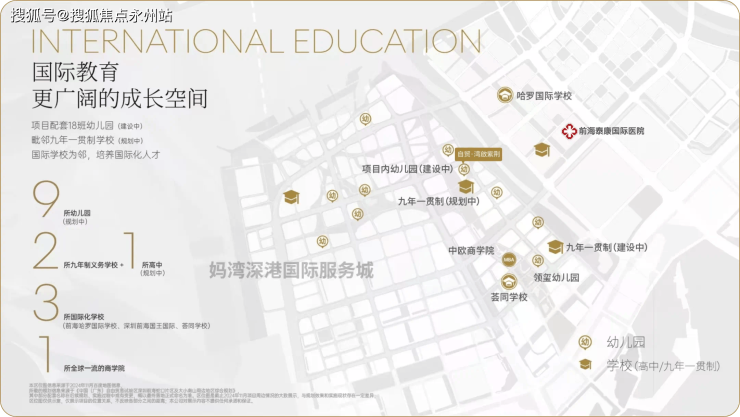 教育资源方面,项目周边拥有15所幼儿园、4所义务教育学校,还有荔湾小学和深大附中等学校都在周边。此外项目靠近多所国际学校,拥有3000到5000个名额,包括荟同国际学校、礼德国际学校、英国国王学校(深圳分校)以及深圳哈罗国际学校。临近小区南侧有一块九年制教育用地,但目前未招标。入住早期可能要到妈湾南二外学校或者前湾南二外学校上学。