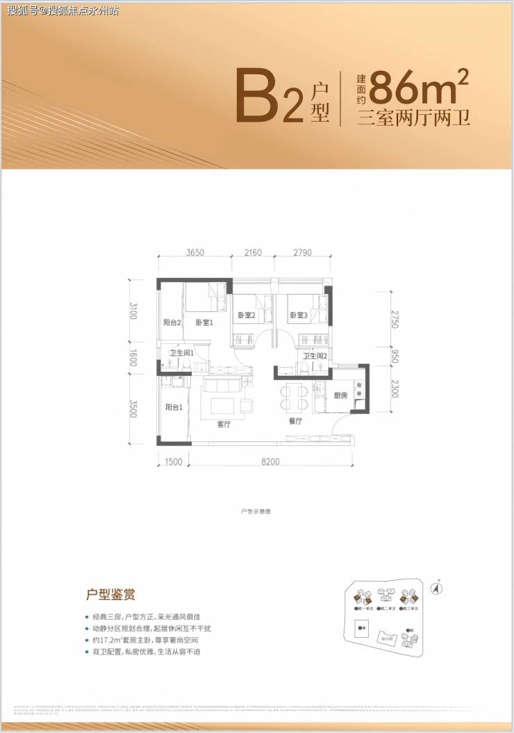 86㎡的3房2厅2卫,设计的是竖厅格局,客厅3.5米开间,进深8.2米,LDKB一体化设计,三开间朝南,3个卧室分别做到了主卧14.76㎡/次卧9.06㎡/次卧7.02㎡(包含墙体飘窗),U型厨房,公卫三段式分离,得房率约88.08%(包含赠送),东南或西南朝向。