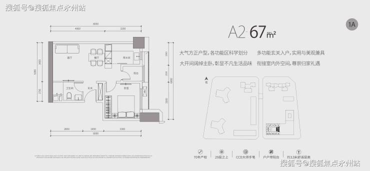 (公寓)推售约67-87㎡1-2房,均位于29层之上高区,享百米以上景观。70年产权,户户带阳台,拥有3.3m超舒适层高。室内公区、样板房均由CCD香港郑中设计事务所设计,将高级定制融入每一寸居住空间