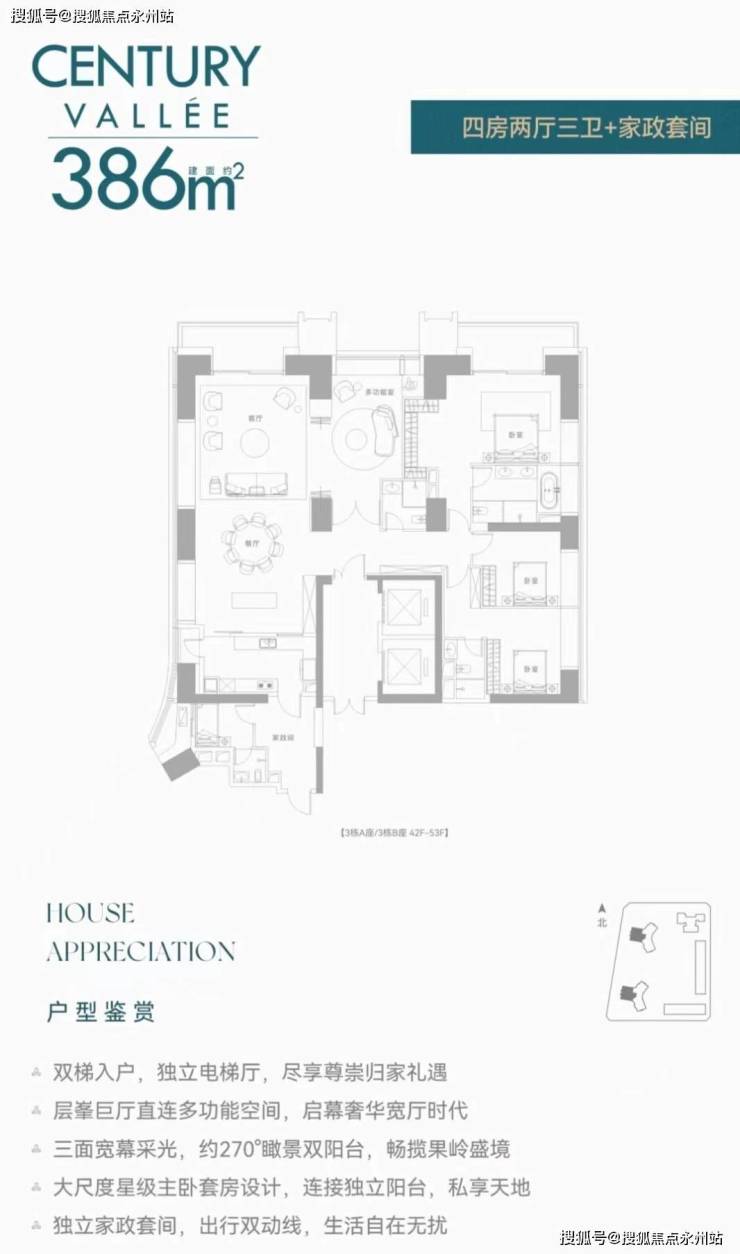 【386㎡4+1房4卫】双梯入户,独立电梯厅,阔绰横厅直连多功能空间,三面舒适采光,主次卧双套房,270°环幕视野,还有独立家政套间,西朝向看名商高尔夫和大河沙生态长廊。