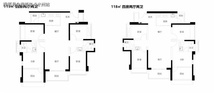 【115-118㎡4房2卫户型】双龙抱珠设计,主要生活空间 ,看中心园林景观舒适四房,三面采光,全明户型