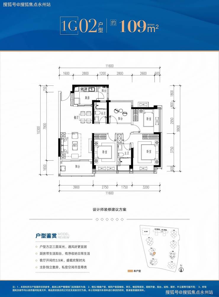 布局:竖厅南北通透,四开间朝南,阳台东北向直面园林,避免西晒。