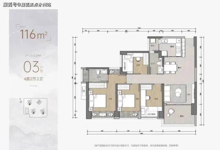 116平在97平原先结构基础上又多加了一个房间,而且客厅开间也是做到了 3.8m 更为阔绰。