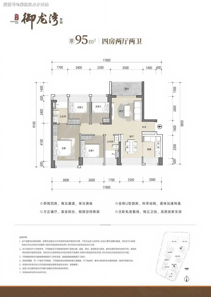 95㎡4房2卫,分布在2栋1单元06户型,设计的是竖厅南北通透格局,客厅开间3.5米,五开间朝南,U型厨房,公卫三段式分离设计,得房率约79.25%(不含赠送),阳台主朝东北向,加上赠送得房率约93%。