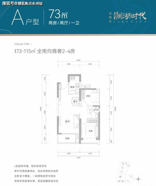 73㎡的2房2厅1卫:设计的竖厅格局,L型厨房,全卧室大飘窗,西南朝向。