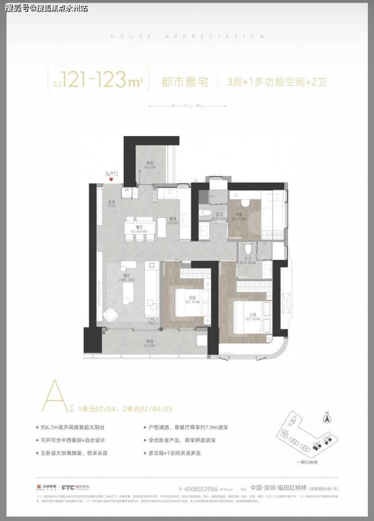 【121-123㎡ A户型 3+1房2卫】分布在二单元02、04、05,竖厅、动静分区结构;