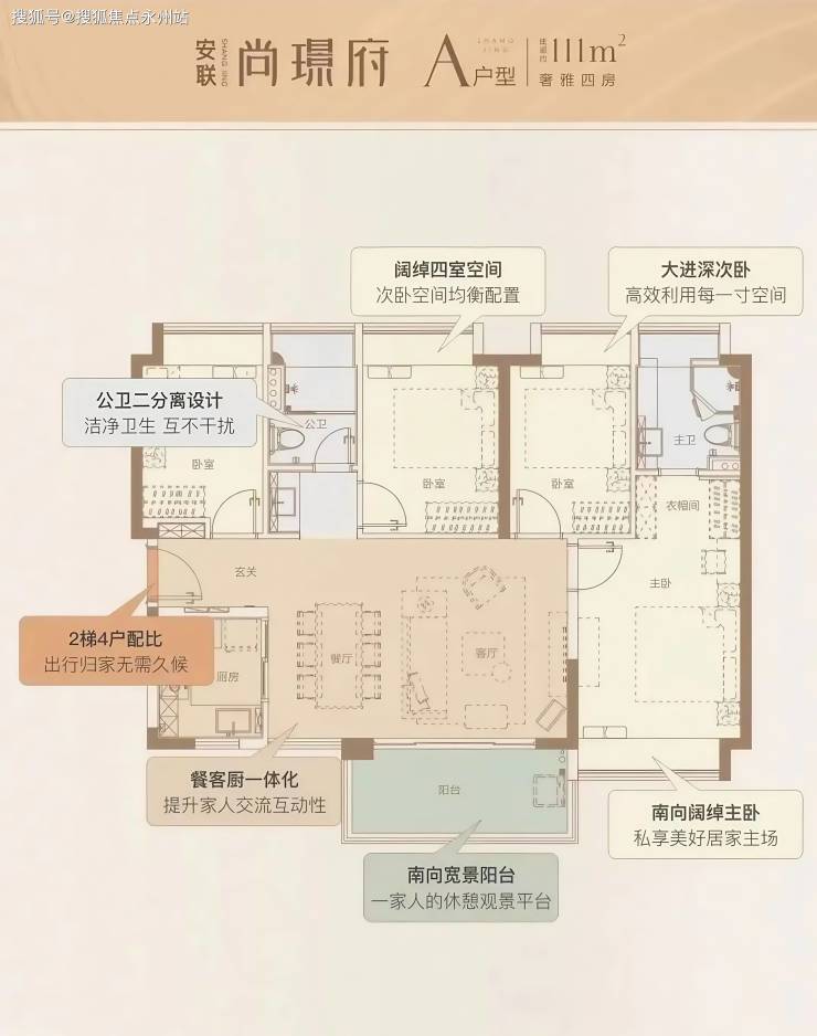 111㎡四房两厅两卫:通透横厅设计,客餐厅开间达5.85米,南北通透;主卧配备独立衣帽间。