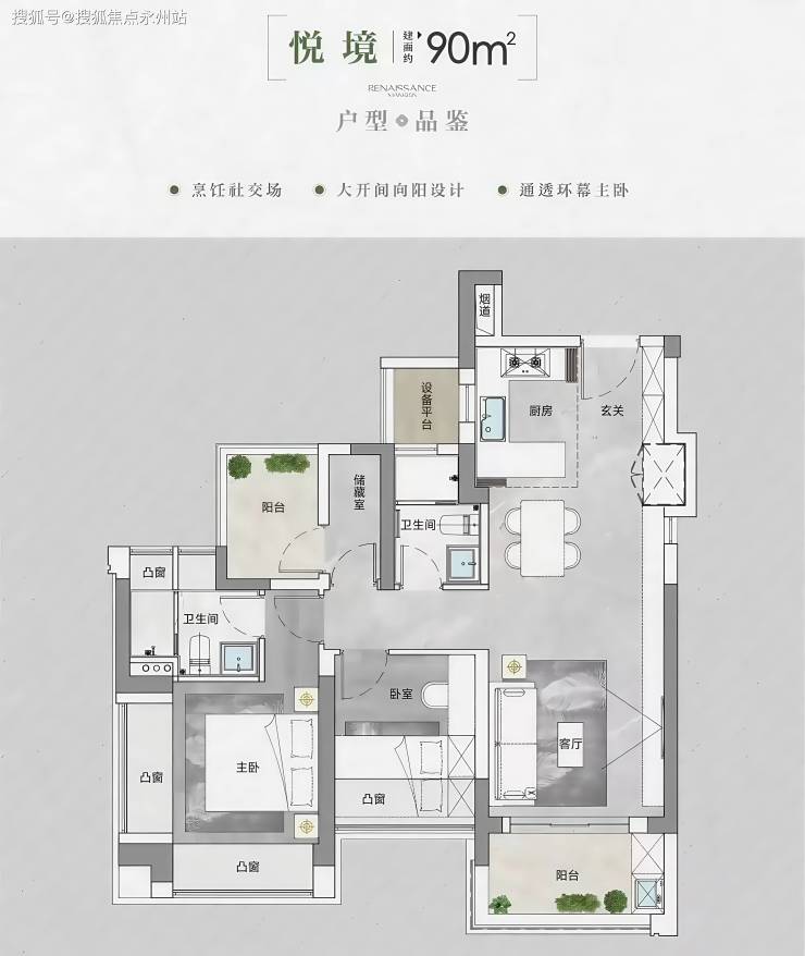首先看看90㎡的3房两卫,使用率含赠送约96.9%,传统竖厅格局,有个次卧需要阳台改房间,主卧双面飘窗采光,其中一面可以用来做衣柜。