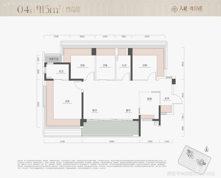 115㎡4房2卫,横厅户型,朝南看海,入户独立玄关,但三个次卧朝北。