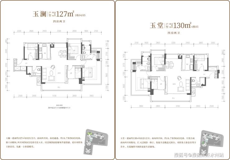 127-130㎡四房两厅两卫均为竖厅南北通透格局,进门设独立玄关,客厅5.1米开间,客餐厅分离设计。主卧带270°转角飘窗及衣帽间,127㎡户型主卧18.55㎡,130㎡户型主卧23.66㎡,其余次卧面积一致(11.2㎡、8.96㎡、7.84㎡)。U型厨房烟道外置,卫生间干湿分离,配备14.09㎡超大阳台,127㎡朝向为西南或东南,130㎡为东北朝向,得房率分别约98.97%、101.95%。