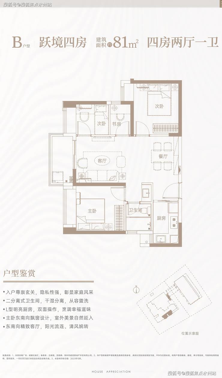 建面约 81㎡ 四房两厅一卫(B 户型)