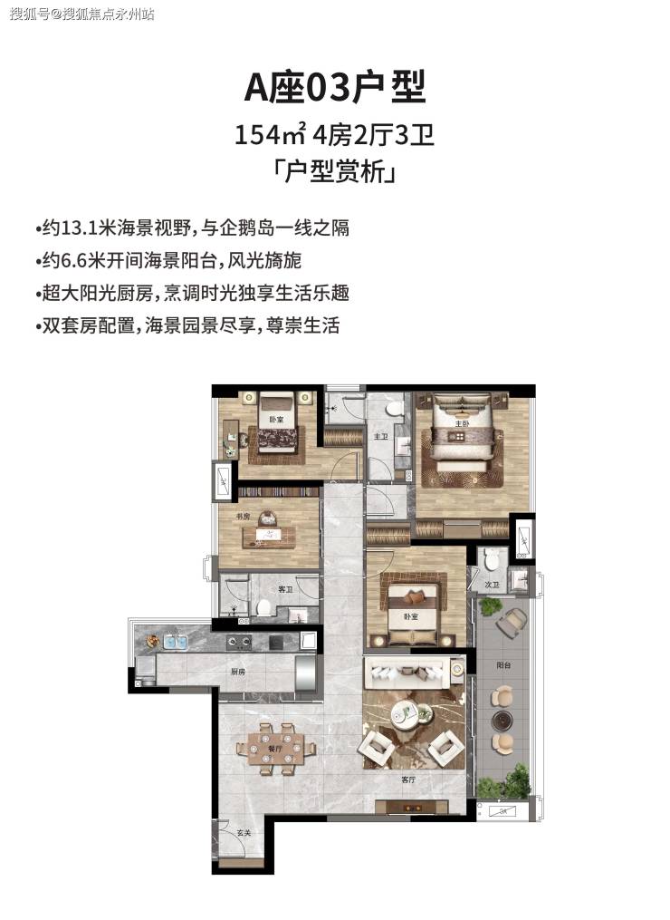 154㎡4室2厅2卫:横厅设计,开间达6.8米,连接阔景阳台,采光通风极佳,厨房采用 U 型布局,预留双开门冰箱位,实用性强。
