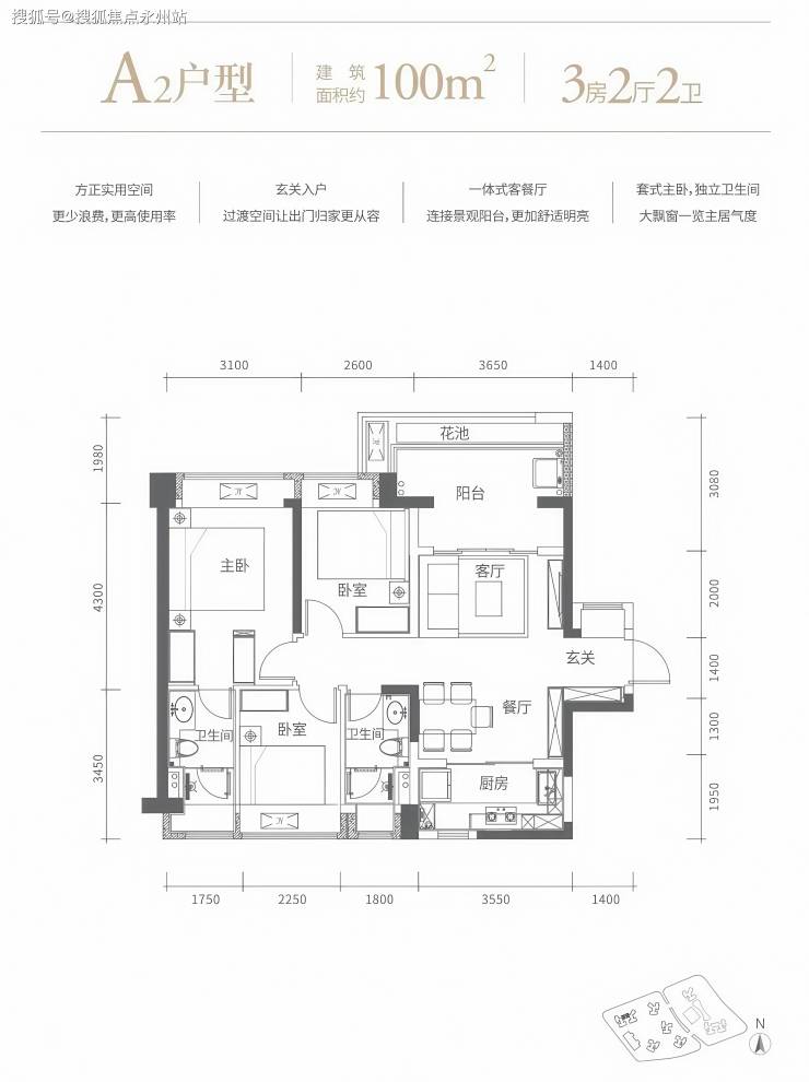 100㎡的3房2厅2卫,A2户型,设计的是竖厅格局,客厅3.65米开间,进门玄关,LDKB一体化设计,动静分区,L型厨房,卫生间干湿分离,阳台主朝东北向。
