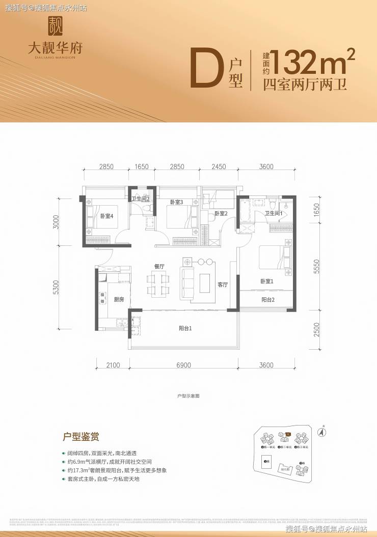 格局:横厅设计,客餐厅开间 6.9 米,四开间朝南,主卧 19.98㎡(含独立卫浴),次卧均超 8㎡。