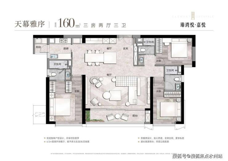 建面约160㎡的3房3卫户型,总价900万起。该户型为西南朝向,可俯瞰铁路公园,采用动静分区设计,双套房配置,客餐厅一体化,大面宽采光,非常适合高端改善家庭或三口之家。