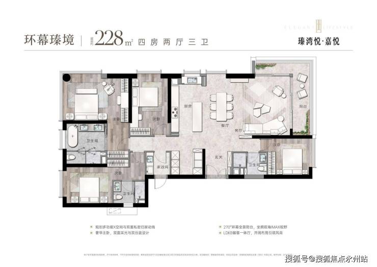建面约228㎡的4房3卫户型,总价1300万起。这个户型最大的亮点是拥有270°巨幕视野的转角阳台,高区单位可俯瞰前海天际线和海湾景观。户型设计为四房全明格局,主卧带独立衣帽间和卫浴,既适合家族居住,也非常适合商务接待。
