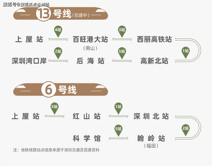 项目直线距离约400米抵达6号线、13号线(在建中)上屋站,6号线8站福田(翰岭站),13号线(建设中)4站南山、8站科技园(高新北站)