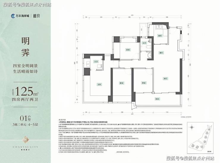 125㎡横厅四房:东南朝向,约12米采光面,主卧 L 型飘窗享270° 环幕视野,折后总价与 121㎡户型相近,适合对景观有要求的家庭。