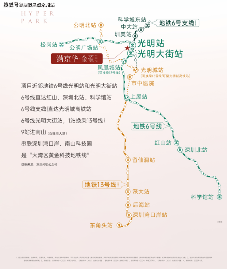 满京华金硕悦府由满京华集团开发,位于光明中心区光辉大道与狮山三街交汇处,紧邻地铁6号线光明站D出口,步行约5分钟可达。