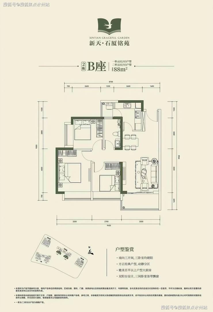 分布:2栋B座一、二单元02、03户型,朝南向。