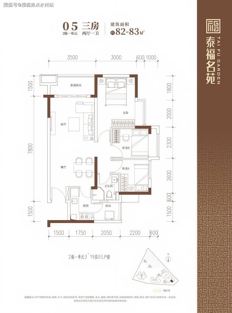 建面约82-83㎡的3房2厅1卫户型,在保证空间尺度感的前提下做到3个房间,实用性高