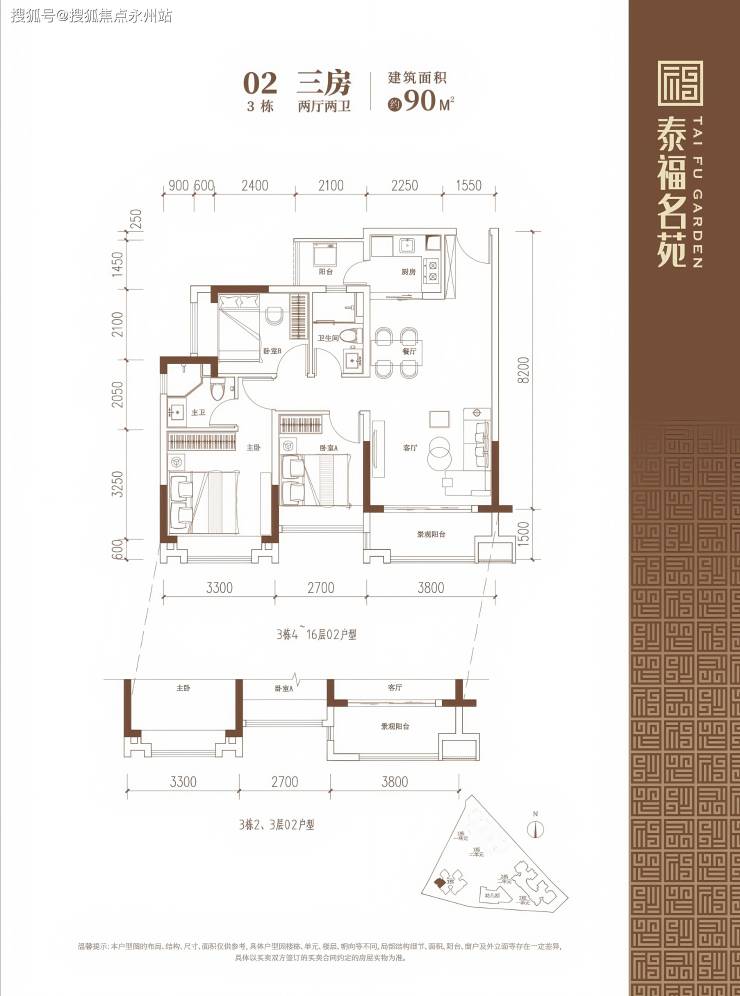 90-102㎡的3房2厅2卫户型。这几个户型都是在主人房多设计一个卫生间,私密性更强,也让家人间的生活更加方便。