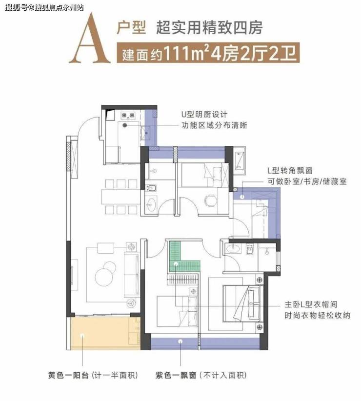 建面111㎡4房2厅2卫A户型:四房设计实用性强,动静分区明确,餐客厅一体,阳台开间宽敞。主卧套房设计,带卫生间和衣帽间,居住舒适度高。