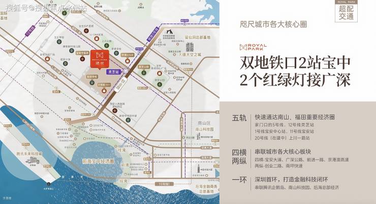 项目为“双地铁物业”,距离5号线与12号线换乘站灵芝站仅约300米(不同地块略有差异),2站直达宝安中心,5站至前海湾站,12号线串联南山、蛇口等核心区。