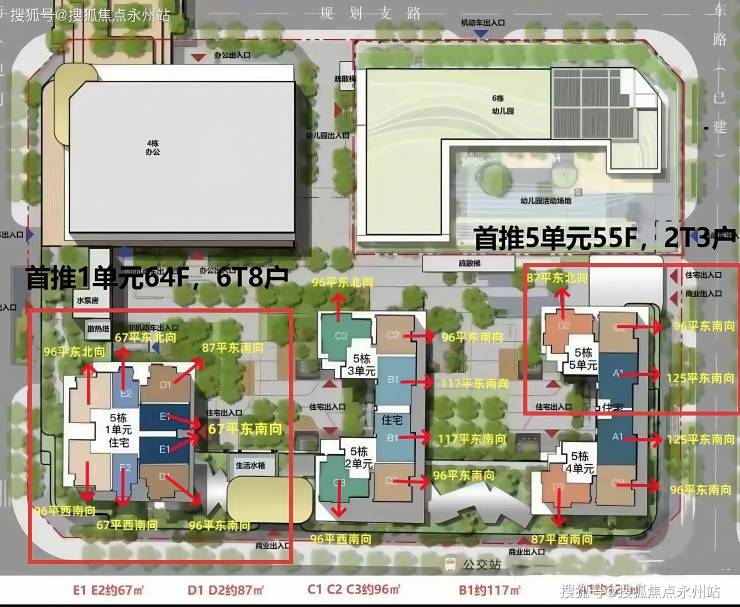 优选5单元的96平C2,3开间东南向,标准动静分区的个局,高区视野通透,另外是1单元的2个96平 C1户型,西南朝向的稍贵一些,东北朝向的上车门槛最低。